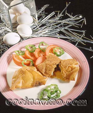 Cortar las láminas de pasta brik por la mitad, colocar un trozo sobre un plato hondo y cascar en él un huevo. Poner alrededor unos trocitos de morcilla, chorizo y sal y envolver los huevos con la pasta haciendo un paquetito. Sujetar con un palillo de madera.Calentar abundante aceite en una sartén amplia y freír los paquetes de huevos de dos en dos hasta que estén doraditos y crujientes. Escurrirlos sobre papel absorbente y servirlos enseguida.
